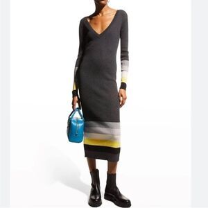 Le Superbe Horizons West Rib Long Sleeve V Neck Sweater Dress | Size L NWT $495 Deep gray double v neck long sleeve sweater dress with light gray and yellow striped accents. Back strap for support in keeping the sleeves in place while showcasing the low v back design. See pics for fabric info. Approx Measurements Across waist: 15.5” Pit to pit: 18” Length: 53” Comes from a clean, smoke-free home. Thanks for looking! QLln238