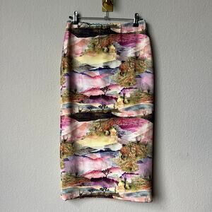 Le Superbe 'Two Timer' reversible midi skirt in Joshua Tree Hollywood de Janiero. Features two vibrant destination-inspired prints: the dreamy desert hues of Joshua Tree on one side and the electric beach vibes of Hollywood De Janeiro on the other. Stretchy fabric hugs comfortably while the double-sided design gives you two looks in one. Size small – 14" waist; 29" length.