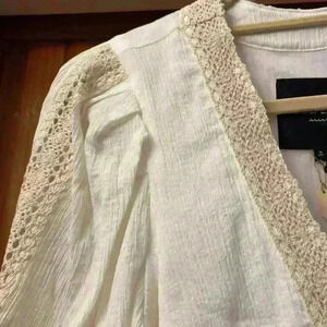 Vacation Ready Long sleeve blouse by Le Superbe. Midweight non-stretch crinkled weave cotton blouse. V-neck, long puffy sleeves with button cuffs. Lace trim down the sleeves plus a lace button placket. Shell is 100% cotton and trim 100% polyester. Size Small NWT 1220