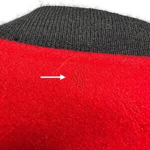 Pre-owned vintage men’s Le Tigre 80s red wool felt bomber jacket featuring two side pockets, smocked cuffs and hem, full lining, and structured shoulder pads.