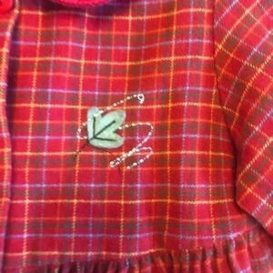 Nice pre-worn condition, no flaws to note. (Tag has been marked with an “M”). Warm, thicker flannel fabric with cute felt and embroidery squirrel, tree & leaf. Perfect for cooler months, especially in the fall!