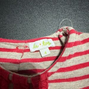 Charming dress with red and cream stripes. Features playful design. Small untreated spot on back 326