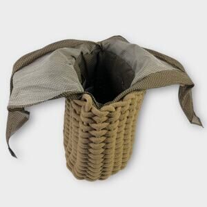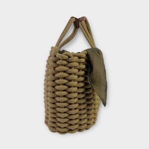 Elevate your casual style with this beautifully woven rope tote bag. Crafted from thick, durable braided rope in a rich earthy taupe, this bag combines rustic charm with modern flair. Its structured design offers both form and function, while the sturdy dual handles—accented with a smooth brown faux leather—ensure comfortable carrying. A subtle detail, the tied polka-dot lining not only is used to keep the bah tied shut, itadds a playful, feminine touch. Perfect for beach days, market runs, or everyday outings, this tote brings texture and character to any look.