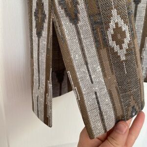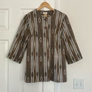 Le Voy’s retro jacket with quarter length sleeves. Art Deco. No size found on material tag but would best fit a medium - please see measurements. Soft brown, gray and white colors. Three statement buttons. In beautiful condition! 60s style.