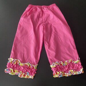 Washed but never worn - excellent condition LeZaMe summer vines open back bow top with pink Capri pants. Pants have an elastic waistband. Sleeveless top ties closed at the top. Lots of ruffles!