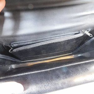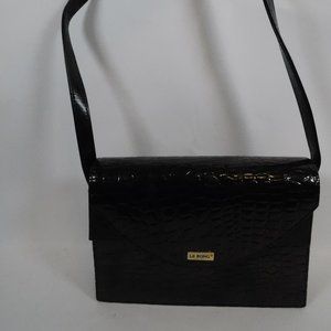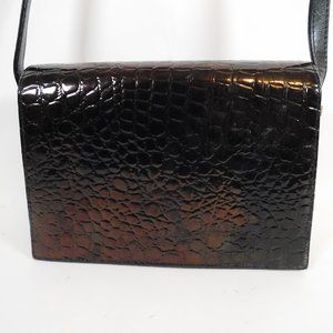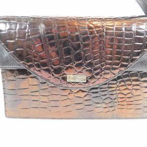 Brown/dark bronze snakeskin-look, ma-nmade materials. Sturdy bottom, purse stands on its own. One snap flap to open, another snap flap for another pocket inside. Very nice purse. Light wear. Check out our other great items in our closet -- create a bundle & save!