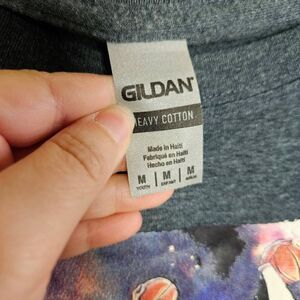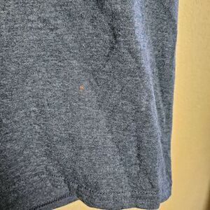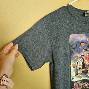 This is a short sleeved grey t-shirt. It features an image of the evolution of LeBron James through all of the teams he has played for. Under the image are the words King James. Note a small red spot as shown in the photos.