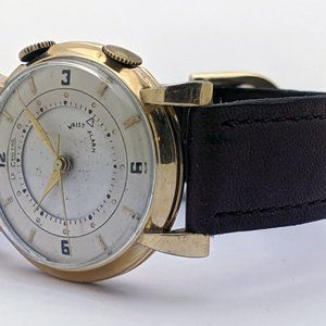 I am selling this LeCoultre (Jaeger LeCoultre for the US market) Wrist Alarm men's watch that was made in the 1950's. The Wrist Alarm is a watch with a alarm complication that pre-dates the Memovox model. It has a 32mm gold filled case with brown leather strap. The watch contains the LeCoultre 489 handwound movement, and runs well. The alarm complication works as it is supposed to. Serial number 671043 dates this watch to the early 1950's. The watch has been worn but is in good condition.