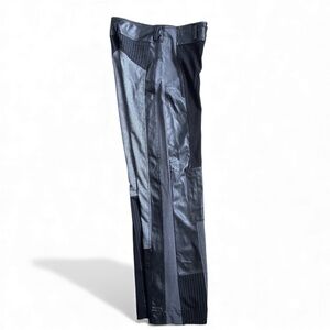 Amazing Italian designer patchwork trousers by LeGatte, crafted from a striking mix of textures and fabrics including suiting wool blends, pinstripes, smooth stretch panels, and faux-leather patches. Each panel is individually pieced for a true artisan look. Straight-wide leg silhouette with a button/zip closure and clean waistband.