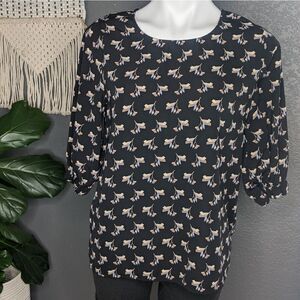 Le Lis black patterned blouse, 3/4 length sleeves with elastic on the sleeves. In good pre-owned condition, does have a very small hole in one armpit as pointed to in pic. Great shirt to dress up an outfit or add a layer to for the fall. Size small.