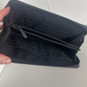 Additional Details: Colorful striped brand stamped print, full length slip style exterior pocket, zip around closure with center zip pocket divided interior compartment/2 full length slip style pockets/8 credit card slip pockets. Style is the Taylor Zip Around Wallet.