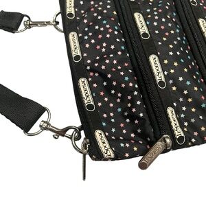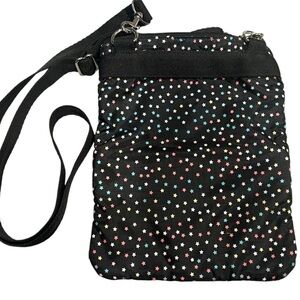 LeSportsac 3-Zip Crossbody Black Stardust Pattern Travel Hands Free Adjustable. Great pre-owned condition.