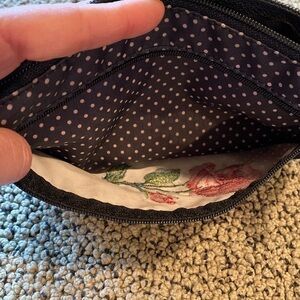 Great little bag to throw into a beach bag or a larger tote. Two pockets. Front pocket has a lining that is wipeable. Cute rose patch on the front.