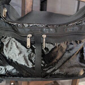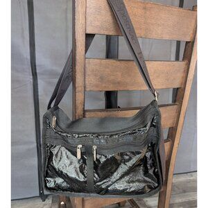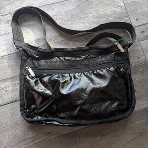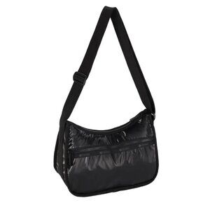 LeSportsac black crossbody, patent hobo, shoulder bag, nylon travel purse, sporty chic, minimalist bag, everyday carry, Y2K street style, lightweight bag