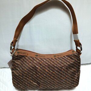 New and unused with tags attached. Measures 9"x5"x3". Strap is not adjustable, measuring 17" long. Interior includes full-length slash pocket on one side and another slash pocket with zippered pocket on the other. Pristine condition.
