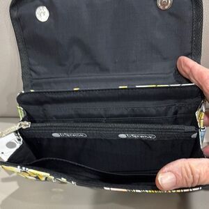 This stylish LeSportsac pouch features a vibrant floral design on a black background, perfect for adding a touch of elegance to your accessories collection.