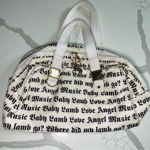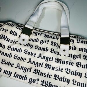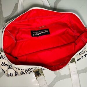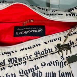 Authentic and in original condition, Gwen Stefani LAMB for LeSportSac overnight duffel bag with white background and black old English font and a beautiful red interior with additional pockets!! all original gold hardware. this has been a great travel bag for me this - it just needs a spot cleaning. It’s super durable & high-quality and I’m gonna be sad to let this go but it’s time for someone else to love it. Open to offers and let me know any questions. 🤍🖤