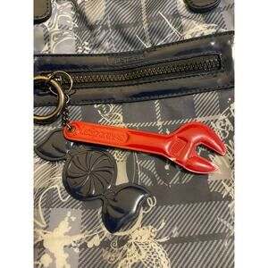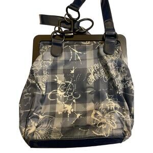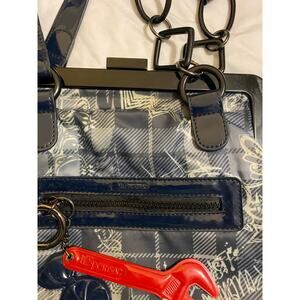 Le SportSac Boutique large "Garbo" Vandal print bag. Done in a light Blue Dark Blue nylon with Navy patent leather trim Navy lucite framed clasp-close top. dual handles patent leather and lucite links.