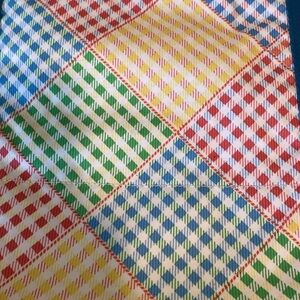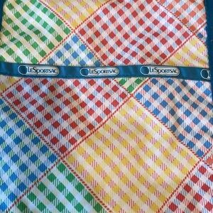 Perfect bag for the beach, pool, travel… whatever!! Very colorful on the outside. Outside deep pocket. Zipper closure on top. Removable smaller zipper pouch on inside with attached inside zipper pocket. Small stain on inside of bag —see pictures.