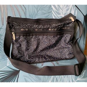 LeSportsac Deluxe Everyday black POLKA DOT EXPANDABLE Crossbody Shoulder Bag Pur
