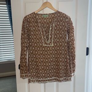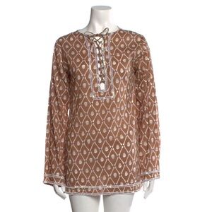 Stylish brown tunic with white patterns. Features a lace-up front and long sleeves.