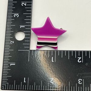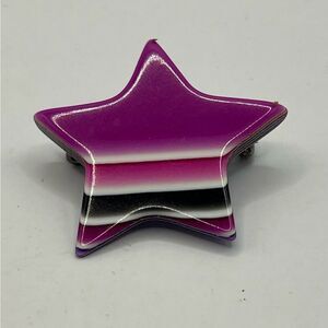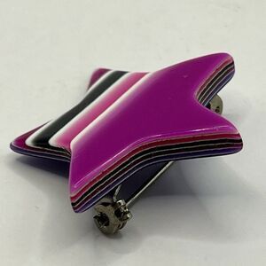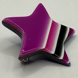 Stylish Lea Stein / Paris star-shaped lucite brooch with gradient design. Features shades of purple, pink, black, and white. In great condition.