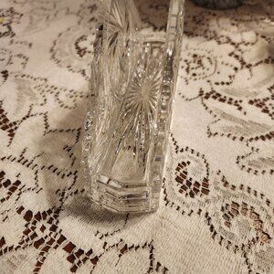 Beautiful hand cut, swirl, and starburst pattern napkin holder w/scalloped edging. Excellent used condition, no cracks or chips, like brand new.