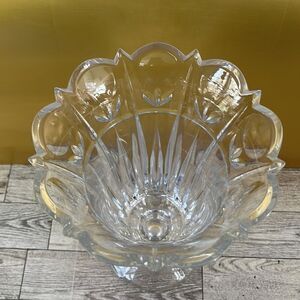 Lead Crystal Etched Vase with scalloped edges. Gorgeous vase, no chips or cracks. Excellently condition. Measures 10” tall, 6.25” diameter at top of vase. Weighs approximately 3 pounds 11 ounces.
