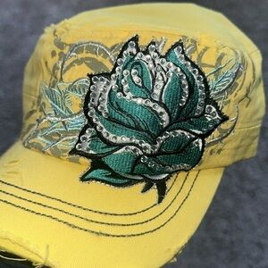 Leader Loga Y2K Rhinestone Bling Fleur De Lis Distressed Cap Hat Grunge Yellow