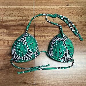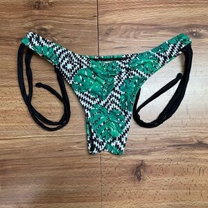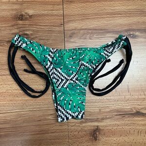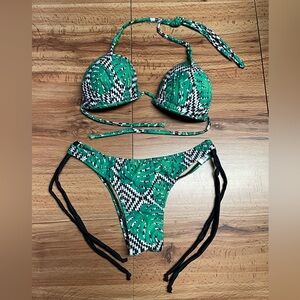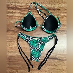 Triangle bikini top with padding. Bikini bottom with side tie. Also has ruched back which helps create a bubble-butt illusion, enhancing your bootie’s curves. Bikini bottom is lined in the front and back