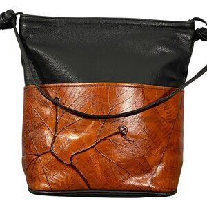 Elevate your style with this unique nature inspired work of art in leather. This crossbody shoulder bag features an embossed leaf fern design. The combination of black leather and detailed brown leaf embossing adds a sophisticated touch to any outfit. With its spacious interior and durable construction, it serves both fashion and functionality.