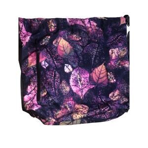 Embrace the beauty of nature with this drawstring backpack, a vibrant statement piece that infuses everyday practicality with artistic flair. Featuring a captivating leaf print in rich shades of purple, pink, and gold, this backpack boasts a convenient front pocket for easy access to essentials. The adjustable black shoulder straps ensure a comfortable fit, making it perfect for hands-free adventures. This versatile daypack is a great companion for weekend hikes or trips to the farmers market.