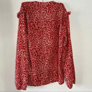 Blouse Red White Leaf Print Botanical Print XL Extra Large Ruffle Shoulder Split Neck Lightweight Coquette Romantic Boquette Boho Bohemian Whimsical Chic Effortless Casual Everyday Spring Summer Flowy Print Top Statement Piece VNeck Long Sleeve Feminine Vintage Inspired Cottagecore Soft Girl Preppy Holiday Vacation Date Night Trendy Maximalist Eclectic Indie Basic Flower Power Lovecore Fairycore Regencycore Prairiecore Goblincore