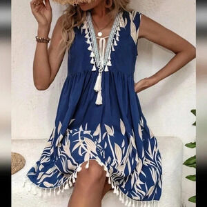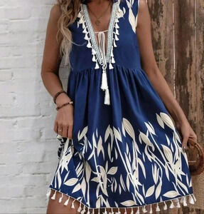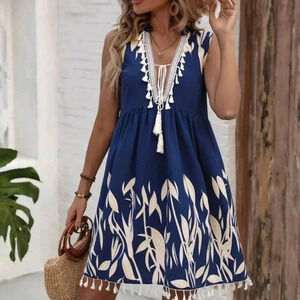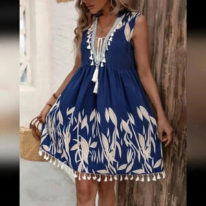 Leaf Print V-NeckFringed Tassel Dress