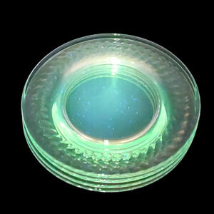 Leaf Rim 7 1/4" Dessert Salad Plates Glows Green with 365nm UV Light Lot of 4. Dishes are preowned and in very good condition. Minimal to no scrapes from normal use. No cracks or chips that I notice (see pictures). All dishes glow green slightly with a 365nm UV light. Item will be packed with care. Message me if you have questions. Browse my store for more vintage and antique collectibles. Reasonable offers are considered.