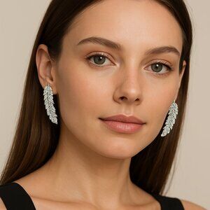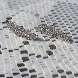 Leaf Shape Stud Earrings Rhinestone Sparkly Silvertone OS