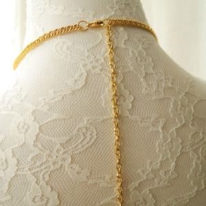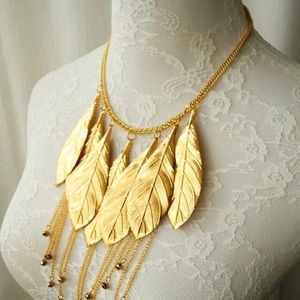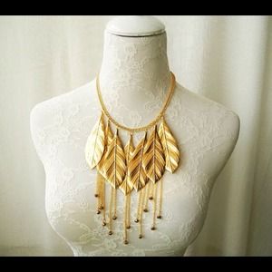 Handmade gold tone alloy bib necklace with leaf tassels. Length: 18". Extender: 5.9". Bought this on Etsy to match a dress for a wedding but it did not ship in time so I no longer need it. Comes in original packaging.