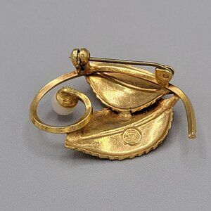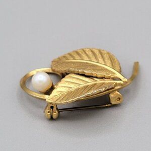 Leaf and Imitation Pearl Brooch Pin Brushed Gold Tone Textured German Made Vtg