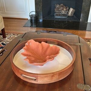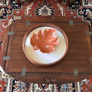 Beautiful leaf-shaped ceramic dish in a vibrant clay red color. Perfect for serving or decoration all year round.