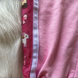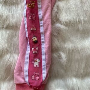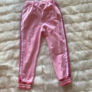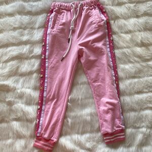 Drawstring, elasticized waistband, thick ribbed pink and white hem at bottom of pants
