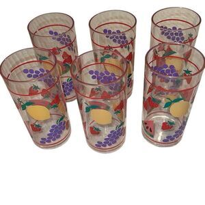 These lightweight glasses are perfect for everyday use or special occasions. The classic fruit designs bring a whimsical charm to your table setting. Each glass features a unique fruit design for a fun touch. The vibrant fruit designs are sure to brighten up any gathering. Perfect for decks and patios great for parties! I used a few times, but in storage the majority of their life.