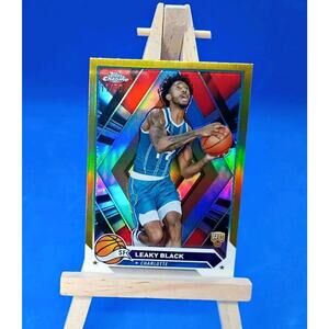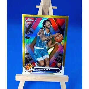 The product is a 2023-24 Topps Chrome Gold Refractor Rookie Card featuring Leaky Black of the Charlotte Hornets in the National Basketball Association (NBA). This limited edition card is numbered 11 out of 50, making it a highly sought-after collectible for basketball card enthusiasts. Manufactured by Topps in the United States, this card combines card stock and metal materials, with a chrome finish that enhances its appeal. As a rookie card, it holds added value for collectors looking to add a piece of the player's early career to their collection.