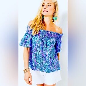 Easy fit, off-the-shoulder top with smocked neckline, and short flutter sleeves.