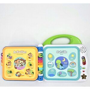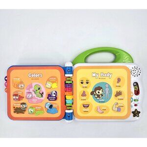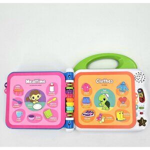 Join animal friends Turtle, Tiger and Monkey as they explore new vocabulary in the Learning Friends 100 Words Book. Explore the colorful pages and touch each picture to hear the animals say toddler-appropriate words along with exciting facts and sound effects. Immerse your child in bilingual play by sliding the language switch to hear the words, songs and instructions in Spanish. Touch the pictures to hear silly sound effects in Fun Sounds mode or press the light-up star button to hear two learning songs. Discover new vocabulary with cute learning friends! Intended for ages 18+ months. Requires 2 AA batteries.