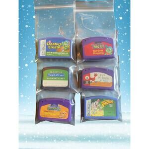 Clean LeapFrog learning game bundle with green storage case. All cartridges are individually bagged for storage and protection. Includes a mix of LeapPad, Leapster, and iQuest titles – perfect for travel, grandparents’ house, homeschool or educational play. Case closes well and keeps everything organized. Shows normal use, but all labels are clear. Untested but appear well cared for. Fast shipping from a smoke-free home.