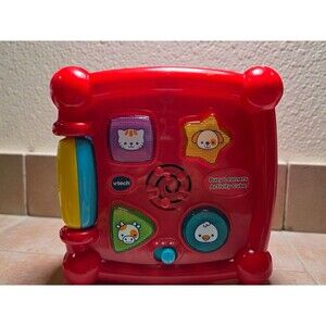 VTech Busy Learners Activity Cube (Red, Model 80-150501) - 5-sided activity center with 14 interactive features, light-up shape buttons, spinning letter blocks, musical instruments. Includes 25 songs and melodies.