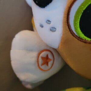 This LeapFrog My Pal Scout is an interactive plush toy dog designed to engage young children. It features a soft and cuddly exterior, bright green eyes, and a distinctive design with colorful ears. The toy lights up and can be used to teach kids through fun and play.