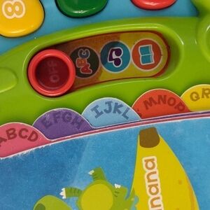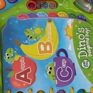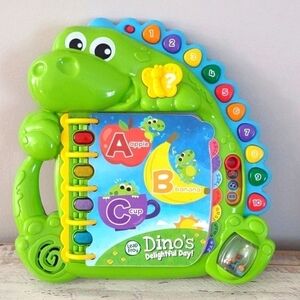 LeapFrog Interactive toddler learning toy. Learning the ABCs is a great way to spend the day! Read about Dino's day while learning the alphabet in the Dino's Delightful Day Book. Letters and words are woven into the story in alphabetical order with phonetic sounds to introduce ABCs to your little one through a charming tale. Toddlers can flip through the 16 interactive pages to hear the story read aloud, or enjoy musical play by jamming to a melody with fun sounds and musical notes. Press the light-up button to hear letter names, letter sounds and words from the story. Number buttons along the dinosaurs back introduce counting and recognizing numbers from one to ten. This complete childrens book with a beginning, middle and end exposes your child to early reading skills. Its a great day, from A to Z! Intended for ages 12+ months.