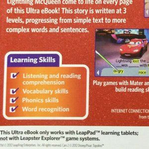 Bring the story of DisneyPixar Cars 2 to life on every page of this Ultra eBook adventure! Objective: Teaches comprehension, vocabulary, phonics and word recognition skills.