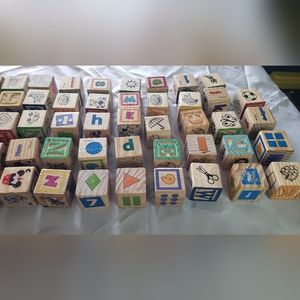 There are 64 blocks with letters and pictures on each block. There are also 11 connector blocks. Great if just learning numbers and letters.